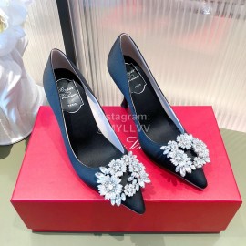 Roger Vivier Flower Diamond Buckle Silk Leather High Heels For Women Navy